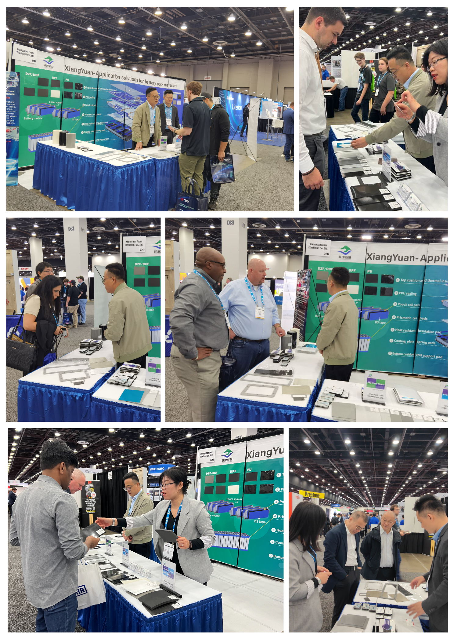 祥源国际贸易部精英们远赴美国,携带聚烯烃、聚氨酯、有机硅胶等发泡材料,以及动力/储能电池内外密封、隔热、支撑、缓冲、保温、阻燃、防火、热失控防护等材料亮相展会现场。