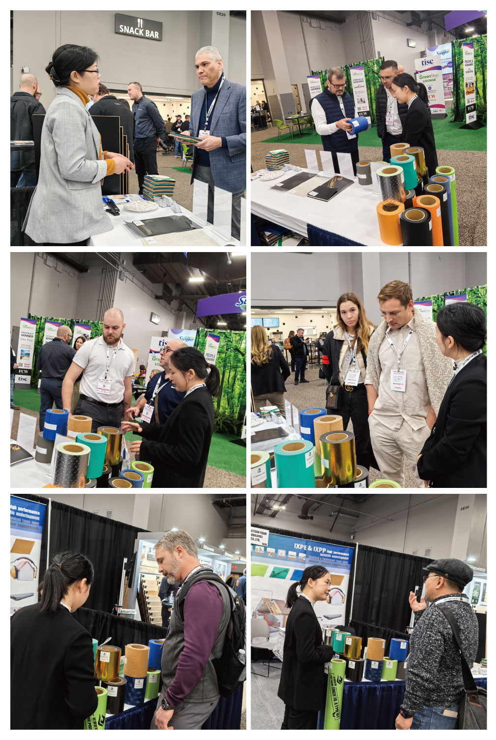 展会现场人潮涌动,祥源新材携带的多款明星产品深受参展嘉宾的青睐,其中地板静音垫的抗菌系列、防滑系列、防静电系列、地暖系列、超静音系列一经展出便吸睛无数,宠物友好垫更是吸引众多宠物家庭的目光,参展嘉宾纷纷前来咨询产品性能,祥源新材的销售精英们以饱满的热情和专业的态度迎接每一位参展嘉宾,为其详细的介绍产品及分享市场趋势,用专业和诚意搭建起沟通的桥梁,为合作奠定了良好的基础。